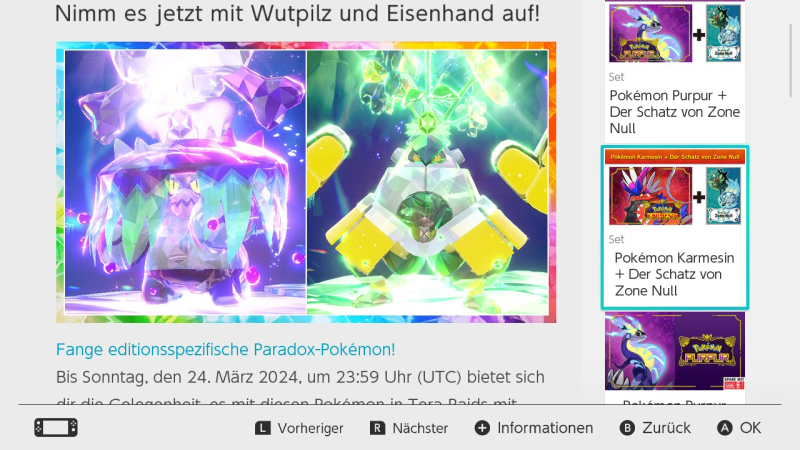 Dabei handelt es sich um 5-Sterne Raids wo beide Pokémon verschiedene Tera-Typen haben. In Karmesin taucht Wutpilz auf und in Purpur Eisenhand.